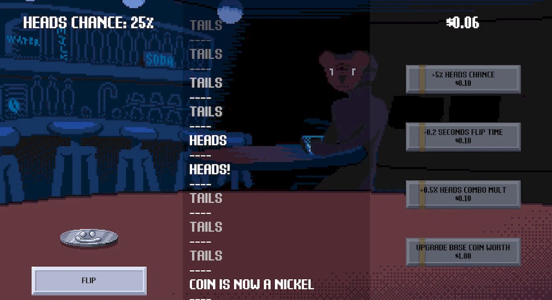 Well, despite the title sounding like the game is unfair, Unfair Flips is an honest exploration of odds and compulsion. There is enjoyment in the randomness and flipping, small upgrades,and in the hopes of catching a streak of ten heads.
